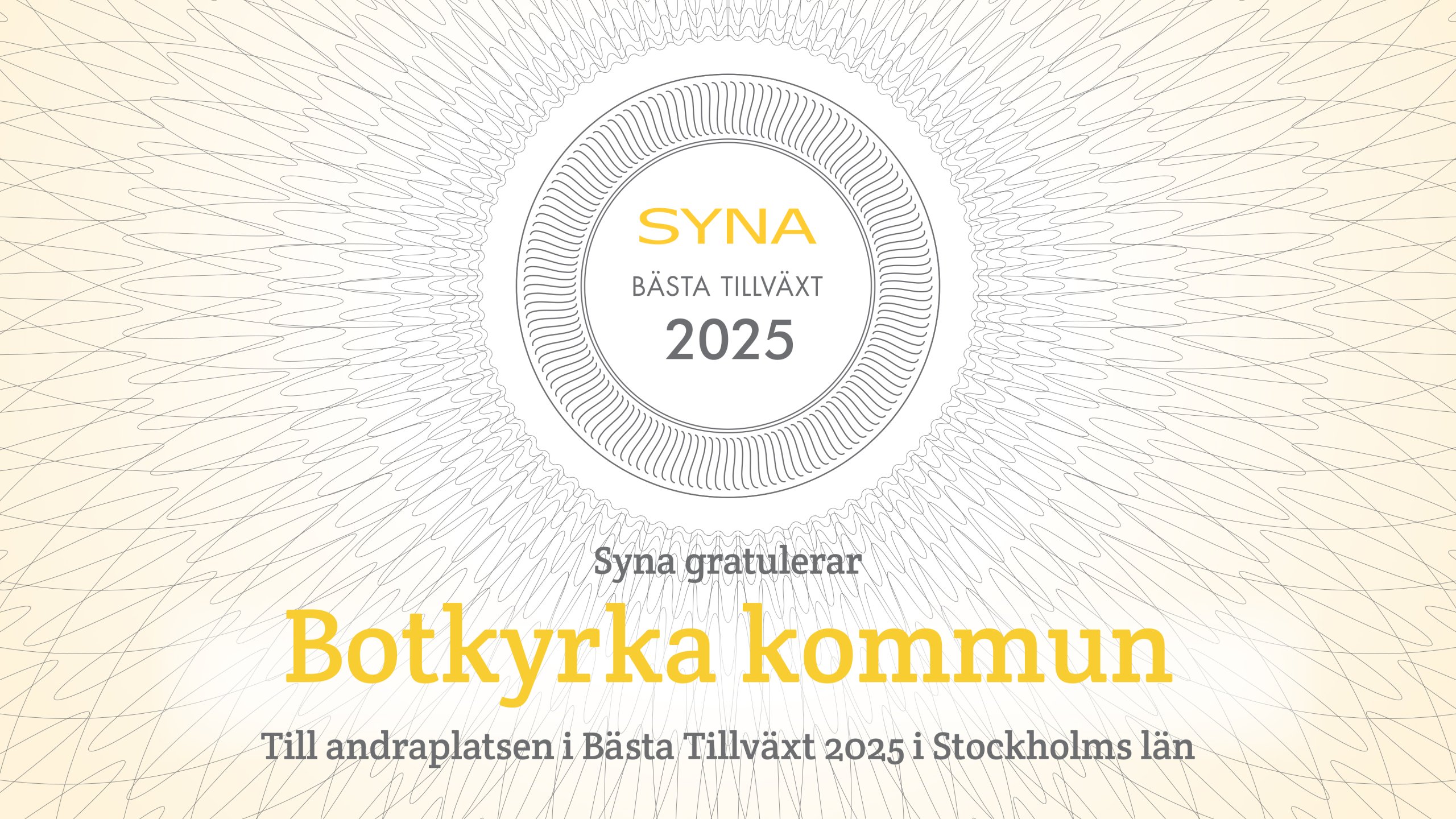 Varje år delar Syna ut priset Bästa Tillväxt till den kommun i varje län där företagen växer bäst. Syna granskar boksluten från alla svenska aktiebolag, och utmärkelsen går till den kommun som har störst andel företag som nyanställer, ökar sin omsättning och går med vinst.