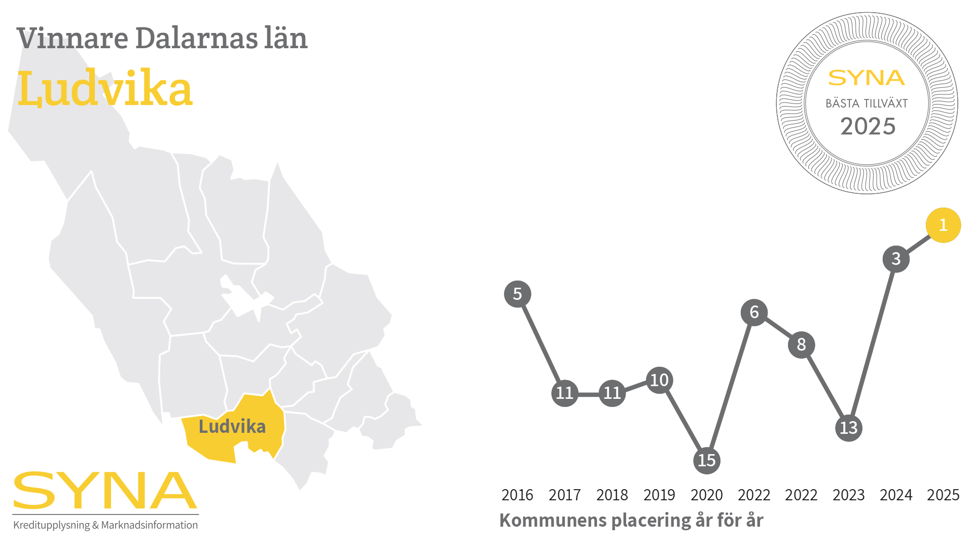 Varje år delar Syna ut priset Bästa Tillväxt till den kommun i varje län där företagen växer bäst. Syna granskar boksluten från alla svenska aktiebolag, och utmärkelsen går till den kommun som har störst andel företag som nyanställer, ökar sin omsättning och går med vinst.
