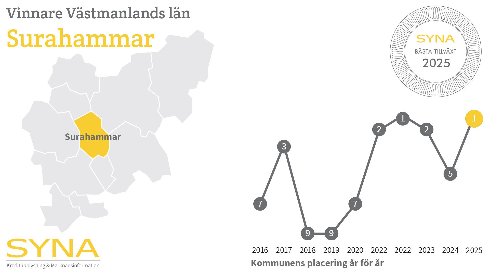 Varje år delar Syna ut priset Bästa Tillväxt till den kommun i varje län där företagen växer bäst. Syna granskar boksluten från alla svenska aktiebolag, och utmärkelsen går till den kommun som har störst andel företag som nyanställer, ökar sin omsättning och går med vinst.