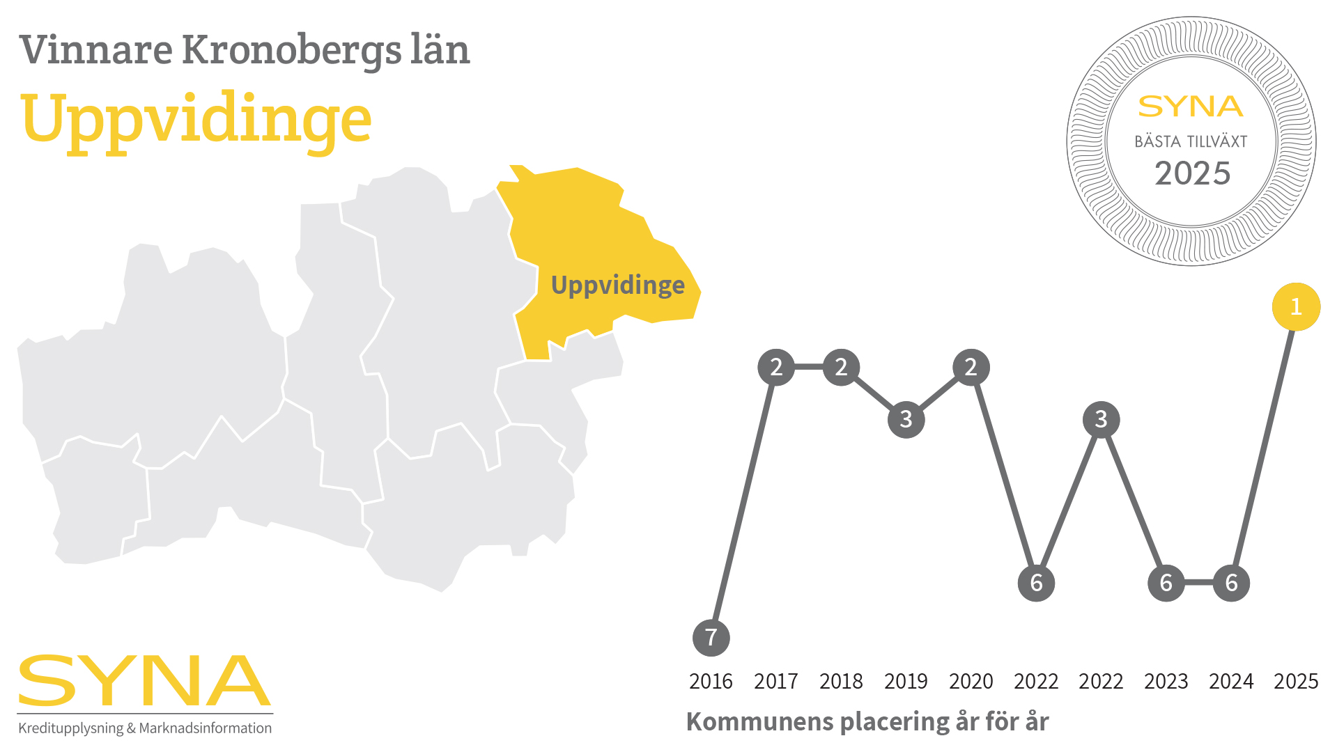 Varje år delar Syna ut priset Bästa Tillväxt till den kommun i varje län där företagen växer bäst. Syna granskar boksluten från alla svenska aktiebolag, och utmärkelsen går till den kommun som har störst andel företag som nyanställer, ökar sin omsättning och går med vinst.