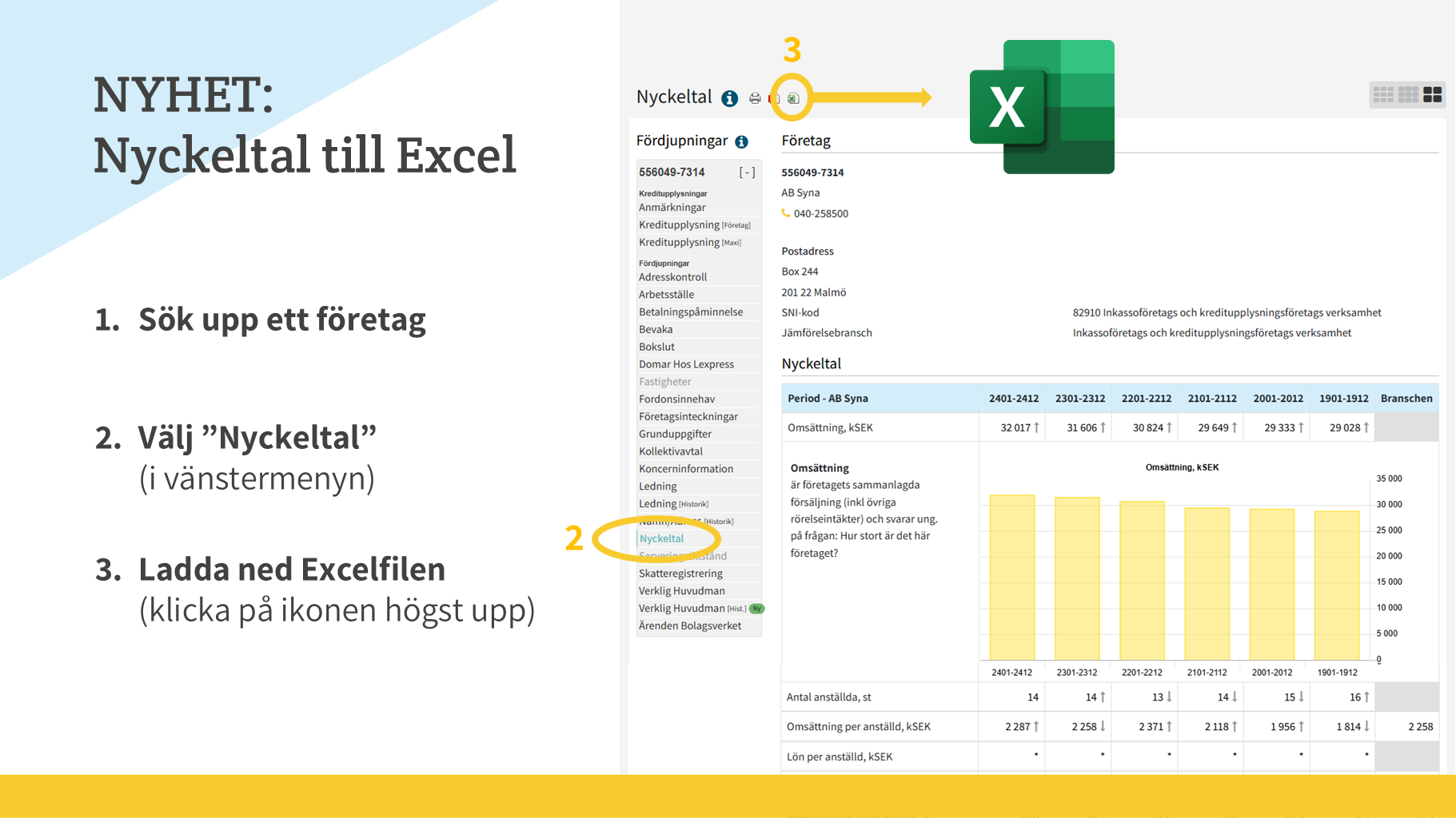 Nu kan du ladda ned “Nyckeltal” i en Excel-fil. Du får siffror för de senaste sex åren, uppställda på samma sätt för alla företag. Sök upp ett företag, välj Nyckeltal i vänstermenyn och klicka på Excel-ikonen högst upp.